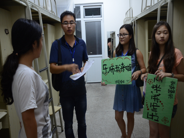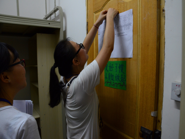 党员同学们轮流对新生所在楼幢寝室进行走访。在走访过程中,对新生及家长们提出的诸多问题耐心回复和解答,叮嘱新生要提高防范校园欺诈行为与注意寝室用电安全意识。与此同时,党员们也贴心地在寝室门口粘贴上14级新生的入学教育流程安排和温馨提示。党员走访新生寝室不仅体现了他们对新同学的热烈欢迎、关心与爱护,也展示了法管学院这个相亲相爱大家庭的温馨与和谐。祝福2014级新同学们都能在乐师这块沃土上学有所获、学有所成!(撰稿人:姚星;审核人:周琴)