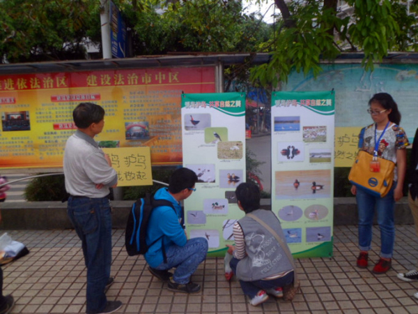 傍晚时分,生科学院的学生党员们来到沫若广场,他们展出各种鸟的照片,向市民发放相关鸟类保护宣传资料,向人们讲解三江水鸟的生活习性、生活环境以及繁殖特性。让人们对三江水鸟有更多的了解,从而提升人们爱鸟护鸟的意识。不一会儿围观的人越来越多,他们睁大好奇的双眼,问各种与鸟相关的问题。学生党员都一一认真解答,并教大家如何认鸟识鸟。整个过程中特别是孩子们表现出别样的新奇,我们也希望他们争做保护鸟类的小卫士,用实际行动,保护生态,呵护生命,为建设美好的家园做出自己的贡献。
