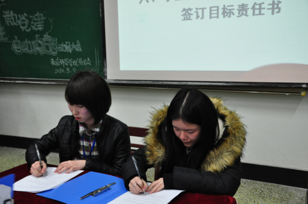 大会第一项议程是由党总支书记佘万斌讲话。佘万斌重点围绕开展“学生微党建”建设工作的背景、必要性以及学生党员应当如何更好的发挥微作用与全体师生展开交流。佘万斌表示本次党员大会既是今年全院学生党员的第一次全体会议,也是我院全面推进学生微党建工作的动员部署会,可以说意义十分重大,希望全体学生党员坚持以自我教育、自我管理、自我服务、自我表率为内在要求,在各个方面充分发挥学生党员的先锋模范带头作用。随后,何永红向大家宣读了《学生党建中心改革方案》,方案中的创新改革对大学生提出了更高的要求和标准,也为学生党员融入微党建建设提供了方向。学生党建中心副主任黄丽豪简单为大家介绍了中心的组织结构。会上,我们隆重推出学生党建手机微信平台,从平台板块的设计到每个板块的内容和意义为同学们做了详细的介绍,希望同学们关注微信平台的动态并积极的参与互动讨论。接下来,各学生党支部书记围绕“学生微党建”项目中的“微服务、微示范、微努力”等子项目的探究做了发言并与党建中心负责人签订目标责任书。最后,会议在王滢同志庄严的承诺后落下帷幕。(撰稿人:闫秋慧;审核人:张红丽)