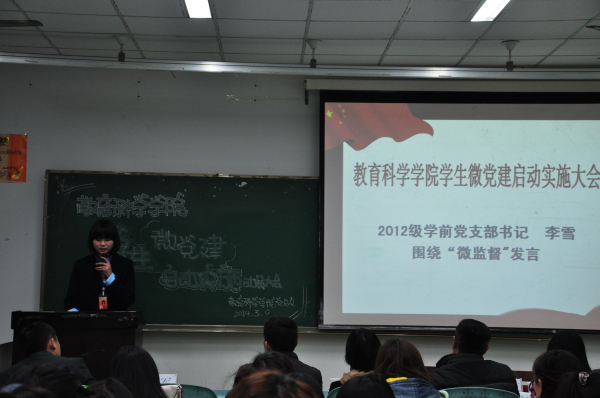 为进一步深入探究基层党组织工作的重点、难点,提升教科学院学生党建中心工作的科学化水平,3月10日,教科学院在行知楼310组织召开“学生微党建”启动实施动员大会。学校党委组织部副部长徐秀云、教科学院党总支书记佘万斌、副书记何永红、学生科科长宋军、学生党建辅导员张红丽以及全体党员参加本次会议,会议由2013级学生党员杨其炎主持。