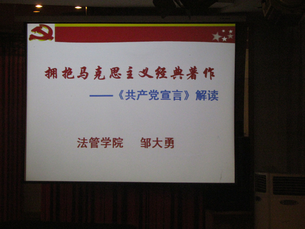11月21日,党委组织部在学术报告厅举行了“红色经典书籍导读”专题讲座。法管学院党总支书记邹大勇为全校300多名学生党员代表作了一场题为“拥抱马克思主义经典著作——《共产党宣言》解读”的报告。